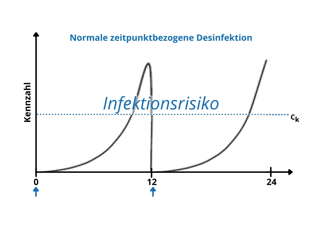 Kurz nach der Reinigung oder Desinfektion können die Oberflächen schon wieder kontaminiert (z. B.: durch Anfassen) sein und ein Infektionsrisiko darstellen.